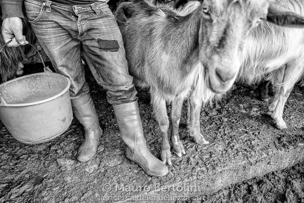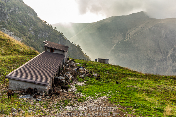 Mentre Amos scende a valle per fare un fugace rifornimento, lo seguo per un breve tratto fino a giungere a un alpeggio in Val Biandino, dov’è in atto l’ultima mungitura della giornata.