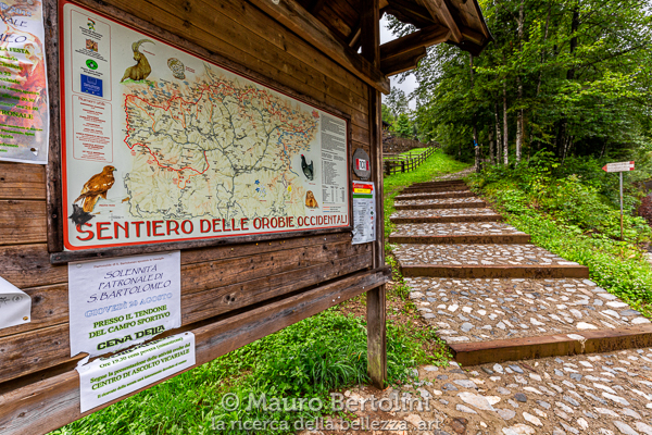 All’imboccatura del Sentiero delle Orobie c’è un pannello in legno con affissa, fra diversi avvisi di manifestazioni ed eventi locali, la mappa che rappresenta l’intero percorso del Sentiero delle Orobie Occidentali. Non potendo fare la solita foto di gruppo pre-partenza, mi limito a immortalare il cartello stesso nel punto esatto in cui nasce il Sentiero CAI 101.