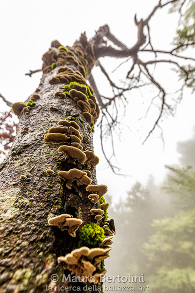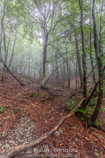 Lungo l’ascesa il bosco rivela il lato tetro del suo carattere: le fitte nebbie penetrano l’intricata volta di rami e foglie dei faggi sfumandosi coi loro maculati tronchi grigiastri, raggiungono il terreno sfiorando delicatamente le secche foglie brunastre cadute l’Autunno precedente senza riuscirle a toccare. Il silenzio e l’umidità sono spessi a tal punto da poterli fendere con un coltello. Mi fermo e assaporo il momento, la magia del bosco, la teatralità della nebbia. Immortalare queste emozioni non è facile, spesso è più semplice provarle e ricordarle che scriverle con la luce o con le parole.