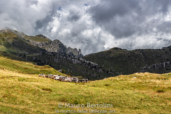 In prossimità della Baita Foppabona la via scende fra i pini mughi e risale poi verso la Bocchetta di Camisolo dove termina la mia prima tappa. Nel tempo che le alte nebbie si diradano, lasciando spazio a un lattiginoso azzurro pomeridiano, sul versante opposto della Valle Foppabona un gregge costituito da qualche centinaia di pecore, forse più, si muove al passo dell’abbaiare dei cani. Sembra una nuvola lanuginosa che naviga in un verde cielo sospinta dai latrati del vento.