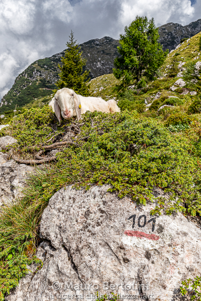 Discendo abbastanza rapidamente la traccia che incide la pietraia e si intrufola fra i mughi. In breve tempo raggiungo i Piani di Bobbio dove mi aspetta, in sonnolente attesa, un gregge di pecore intento ad assaporare i caldi fasci di luce che penetrano le sempre più rade nubi. Una pecora, su tutte, cattura il mio sguardo: tranquilla e beata si crogiola al Sole sopra un masso ammantato da ginepri, lo stesso pietrone che riporta l’indicazione “101” sottolineata con una svogliata pennellata di rosso. Si sveglia lentamente mentre sono intento a fotografarla, gira il capo a ciondoloni verso l’obiettivo che l’osserva, e gli occhietti piccini piccini velati dal sogno interrotto mi guardano senza luce, appoggia il muso sul ginepro quasi a mettersi in posa sopra il segnalino orobico, diviene l’attesa per riprendere sonno.