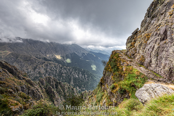 L’alta via si addentra immediatamente nel bosco di latifoglie costituito in prevalenza da faggi, i quali, sporadicamente, lasciano posto a carpini, betulle e a qualche abete. Con la stessa velocità con la quale si tuffa nella faggeta, il primissimo tratto del sentiero si inerpica velocemente lungo i pendii della Valle di Cassiglio. Lungo il cammino la via si interseca, per un breve tratto, con la strada del fondovalle in alterni pezzi cementati e sterrati; l’escursionista non deve disperare, il sentiero è proprio dietro l’angolo. In poco tempo mi ritrovo a risalire rapidamente i fianchi boscosi delle montagne e la strada sterrata diviene immediatamente un flebile ricordo.