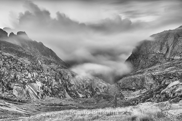 La traccia è ben segnalata e sale dolcemente fra torrentelli sprizzanti di gioia incuneati fra levigate placche rocciose. Le cime delle montagne si stagliano nel leggero cielo cristallino, a Est chiaro come l’acqua e a Ovest cupo come l’oceano. I versanti delle montagne si incurvano sotto il loro stesso peso, in alto si ergono come creste di preistorici dinosauri e in basso si rilassano come obesi trichechi spiaggiati. I piedi delle montagne si celano sotto le cineree nebbie ondeggianti che salgono dalla Valle Zocca.