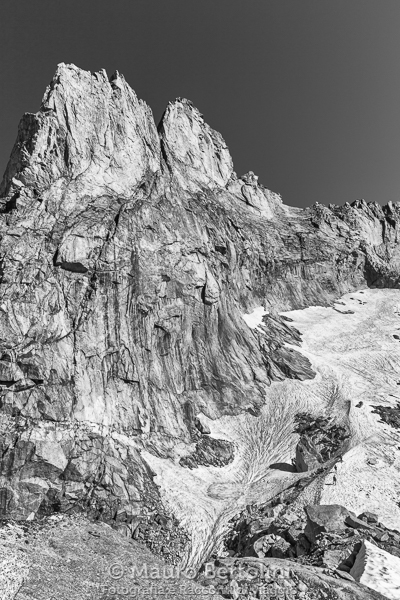 Torniamo al sentiero senza perdere troppo tempo e riprendiamo l’ascesa, il Passo di Cameraccio è più vicino. Affrontata una penultima salita fra sfasciumi vari ed eventuali punteggiati qua e là da informi omini che sorvegliano il viandante, si arriva a un falso pianoro dove si intravede quello che una volta fu un solenne ghiacciaio, ora è solo una bianca lastra priva di vita che giace inerme su una lingua di roccia bagnata dalle sue stesse lacrime, in diversi punti è crepata dal caldo e sotto di essa sono crollate le ultime stille di dignità. Con tristezza immensa aggiriamo, o attraversiamo, il nevaio accovacciato nei detriti pietrosi che salgono al passo. Con un ultimo sforzo arranchiamo su infide ghiaie e scivolose pietraie fino alla prima catena. Infine, con l’ultimo colpo di coda, ci tuffiamo nella luce splendente del sole che filtra fra le sponde rocciose della conca a quasi tremila metri di quota.