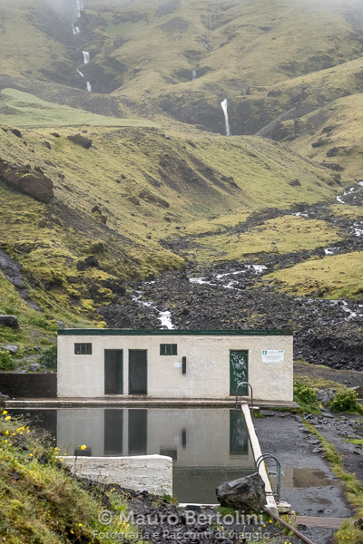 Avvicinandomi alle terme, le basse nuvole sono risalite leggermente lungo i versanti lasciando intravedere due serie di cascate che, in sequenze di cinque o sei balzi, scendono dai pendii lungo profonde rughe intagliate nella dura roccia. Il paesaggio è magico. La piscina rettangolare è appollaiata sul basamento del versante sinistro della valle, le sue mura chiare stagliano con la sua acqua scura e le scure rocce tutt’attorno. Gli smeraldini prati che ammantano i pendii sono screziati da gialli e viola, e punteggiati da sparuti cespugliotti lanuginosi neri e bianchi che placidamente brucano l’erba. Il torrente gorgheggia sul fondo e saltella di sasso in masso con spumeggiante libertà. Sopra tutto e tutti un tetto dalle più svariate sfumature di grigio. L’aria è frizzante e briosa con una nota umida dal sentore di erba e di muschio, di roccia bagnata e di pioggia.