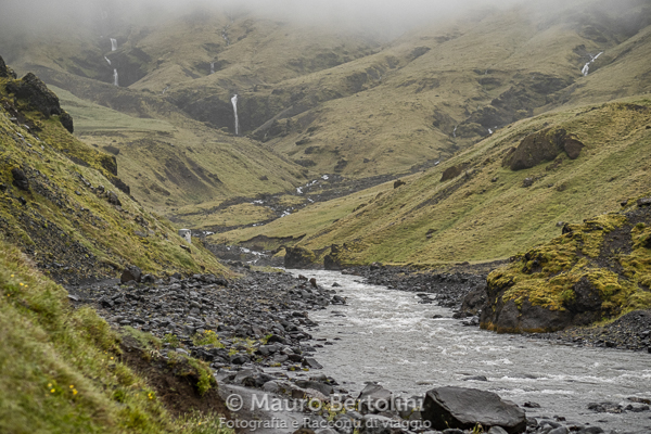 Cedo la cascata all’ammirazione di altri turisti mattinieri e mi dirigo verso la sua vicina, la Cascata Gljufrabui, seguendo un sentiero che corre parallelo alle fondamenta della bastionata rocciosa.