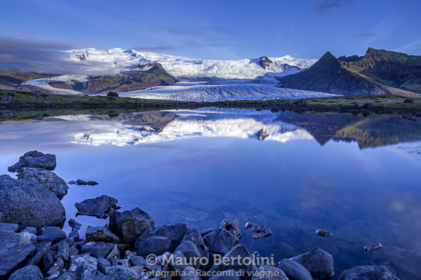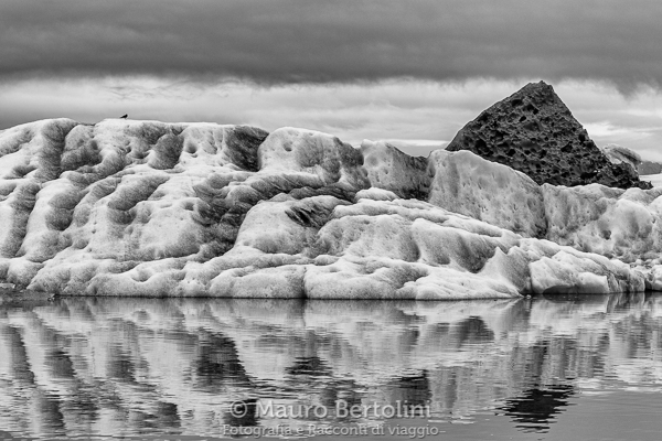 I varchi di luce irradiano una tiepida luminescenza sui crepacci dell’antico Ghiacciaio Vatnajökull che, grinzosamente, scivola sul fondovalle fino alla sottostante laguna incorniciata dalla morena. Le vette delle montagne, quelle rimaste ancora visibili, svettano verso l’azzurro, quello rimasto ancora cristallino, alla ricerca di un fuggevole tepore, quello rimasto e non ancora assorbito dalle nubi. La laguna osserva impassibile il flemmatico mutare degli eventi che si susseguono sopra le sue quiete acque, ne riproduce le vicende con dettagli increspati da interferenze impalpabili, fresche e fuggevoli.