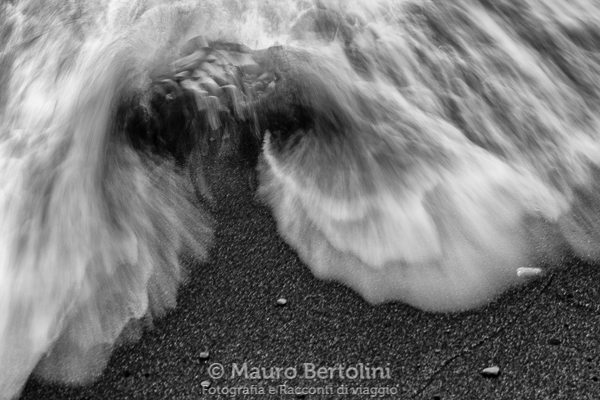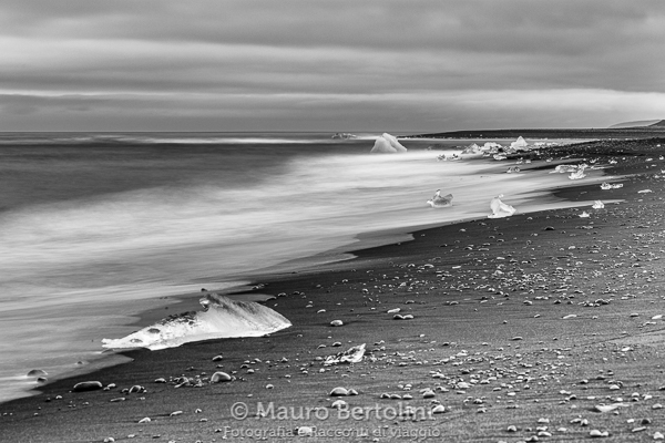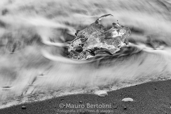 La compagna di brevissime avventure si volatilizza, come un battito d’ali di un moscerino, verso lidi più sicuri e non disturbati; il nostro incontro è durato troppo poco. Non potendole più donarle sguardi ricolmi di ammirazione, rivolgo le mie attenzioni agli iceberg arenati sulla spiaggia nera; l’obiettivo odierno è quello di immortalarli con le onde che li avvolgono cercando di realizzare effetti seta fotograficamente accattivanti. Penso e ripenso alle opere digitali pubblicate nel web da tutti i miei predecessori, mi concentro in questa tecnica con scarsissimi risultati e innumerevoli insuccessi. Non comprendo, non capisco in cosa risieda il mio errore: sono io quello impedito o sono le onde impetuose a non facilitarmi il compito? Passata un’ora, o forse più, lancio la spugna alle spumeggianti onde e, completamente abbattuto, penso a come scordare il non risultato.