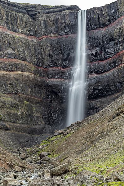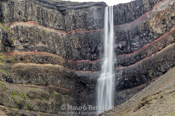 L’ultimo tratto si insinua direttamente nella stretta valletta le cui pareti sono disegnate e dipinte da variegate linee di roccia che risalgono ad ancestrali stratificazioni temporali. In fondo al canyon, nel punto più estremo della gola, là dove le orizzontali rocce rosso-nerastre si incontrano, la Cascata Hengifoss si slancia nel vuoto con un salto di decine e decine di metri verticali fino a scomparire nelle sottostanti rocce che l’attendono.
