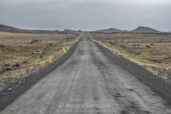 La strada è una lingua infinita di nero bitume che taglia la desolata landa, questa si dilegua a perdita d’occhio fino al limitare estremo dell’orizzonte in cui basse cime montuose fanno capolino verso le nubi. La pioggia diminuisce gradualmente fino a interrompersi e qualche barlume di luce illumina le nubi meno arcigne. Le previsioni meteo islandesi sembrano impeccabili ed entro un paio di ore dovrei avere l’inimmaginabile onore di essere baciato dal sole; lo spero con tutto il cuore.