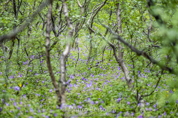 Lascio l’auto e scelgo uno dei tanti sentieri che si diramano nella selva, il principale è quello che porta direttamente verso il Lago Botnstjörn. La camminata è breve e molto piacevole, sembra di essere in un fiabesco bosco in cui potrei incontrare fate o gnomi. I colori tenui dei tronchi delle betulle contrastano coi verdi delle erbacee e delle chiome degli alberi, numerosi fiori viola e gialli punteggiano il sottobosco. Uccellini invisibili canticchiano allegramente fra le fronte delle piante alla ricerca degli uni o degli altri. Rami contorni e tronchi informi, alcuni vivi e altri secchi da anni, disegnano amorfe creature dagli spettrali lineamenti.