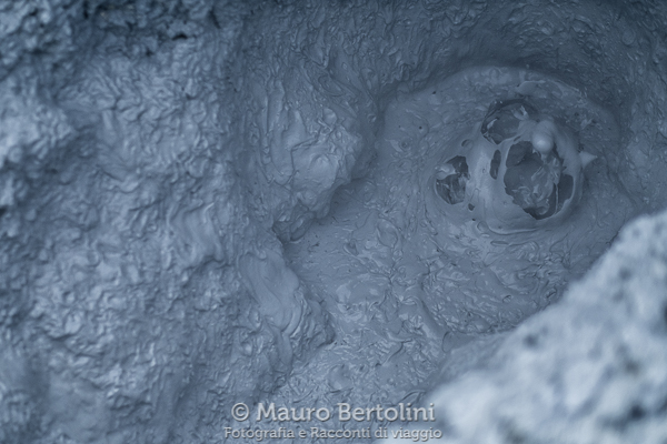 Dapprima lo sguardo si muove lentamente lungo la circoscritta piana fangosa per osservare minuziosamente quello che ha da offrire, per poi saettare da un punto all’altro alla ricerca di fuggenti attimi da catturare. Il profumo solforoso aleggia nell’aria sospinto da un vento leggero, mi avvolge completamente inzuppandomi le vesti con il tipico aroma di uova marce che, da oggi in avanti, mi accompagnerà con certezza per tutto il viaggio. Ai miei occhi si mostra un panorama terroso dai colori grigio, rosso, ocra, giallo e arancione con tutte le loro relative variazioni di tenui tonalità che vanno a sfumarsi, le une con le altre, in un confuso dipinto di disordinata armonia. Alcune pozze cineree esalano trasparenti velature biancastre che si sciolgono rapidamente nell’etere cristallino accarezzato dalla brezza serale, altre gorgheggiano con cupi suoni gutturali all’interno delle loro buie cavità melmose sprizzando, verso l’esterno, mollicci lapilli cinerei come microscopici vulcani incompiuti. Esigue lacrime di sangue graffiano il suolo con un lento fluire di acque ferrose che ne ravvivano i toni con screziature di rossi e arancioni. In lontananza, basse piramidi di rocce evaporano furiosamente in un turbinio di colonne di fumo grigiastro, ululano al cielo con rombanti fischi di forza ed energia, canti infernali di anime dannate che il vento disperde nelle vicine lande desolate dimenticandone ben presto le parole. Il sentiero che nasce dalla torreggiante piattaforma lignea si dirama in questo mondo tracciando lievi vie che segnano il confine fra il Purgatorio umano e l’Inferno vulcanico, oppure indicano l’ingresso agli inferi qualora l’insolente turista decida di oltrepassare l’effimero cordone di sicurezza per accarezzare l’idea di un ribollente selfie. Dalla sua eterea altezza celeste, il Paradiso atmosferico osserva il mondo con immaginari occhi nebulosi sospinti dalle correnti d’aria, mentre un tramonto senza fine ne satura i colori con gialli e arancioni pastello.