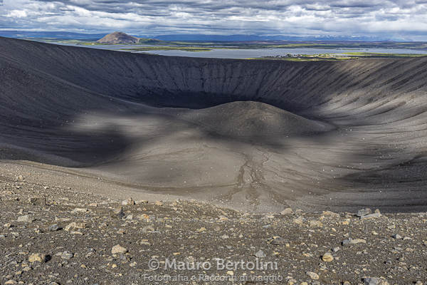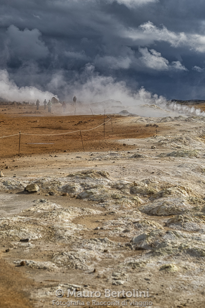 Spengo l’auto in un posteggio panoramico che sovrasta la valle. I pensieri tornano alla doccia, lo sguardo si allunga verso la valle al centro della quale troneggiano le futuristiche strutture dell’Impianto Geotermico Kröflustöð. Le colonne di vapore acqueo della centrale elettrica salgono verso le alte nubi, alcune vengono stiracchiate dal vento che le inclina facendole quasi cadere a terra. Il panorama è brullo, marrone con sfumature rossicce o nerastre, terra e roccia, spoglio di vegetazione tranne per alcuni crinali leggermente erbosi, verde sbiadito con tracce giallognole e ocracee, erba e terra e roccia. Le nubi tendono a diradarsi nell’area di Hverarond, ma in lontananza, verso le terre di nessuno, sta sopraggiungendo un muro grigio antracite che minaccia l’intera zona con il suo nubifragio. Dapprima investe le lontane zone geotermali, poi imbocca la valle e come un branco di elefanti imbizzarriti si scaglia con tutta la sua irruente violenza sull’intera zona. Oblio, nulla, grigio, io e l’auto, il resto è stato ingurgitato dal mostruoso temporale che ha fagocitato il mondo intero. Sulla carrozzeria e sui vetri si schiantano milioni di milioni di pingui goccioloni, ho seriamente paura che abbiano intenzione di demolirmi l’auto. Con la stessa velocità con cui è arrivato il mastodontico nubifragio, così repentinamente se ne va. Silenzio. Esco e non vola una mosca, forse sono annegate tutte. Alle mie spalle il nero si schiarisce sfumandosi in tonalità sempre più chiare di grigio, davanti ai miei occhi il cielo livido inizia a schiarirsi e a far trapelare numerosi raggi di luce.