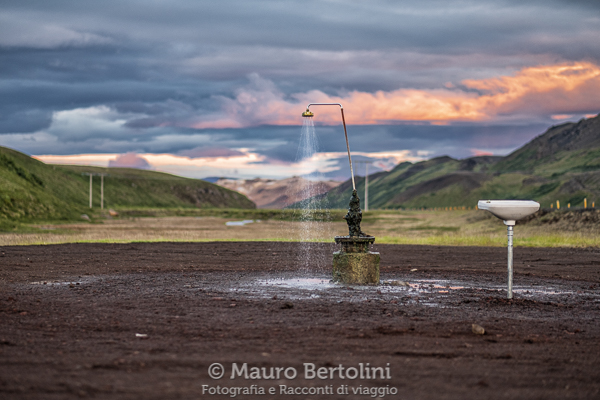 Lungo la strada scorgo sulla destra uno spiazzo con due camper fermi e un gruppetto di persone che gironzola attorno a una doccia posta al centro del parcheggio sterrato, una doccia a cielo aperto, una doccia nel bel mezzo del nulla, una doccia con calda acqua fumante. Proprio bizzarro! Spero non siano allucinazioni.
