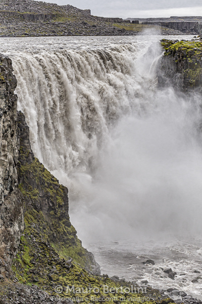 Parcheggiata l’auto, seguo le indicazioni per la cascata. Saltellando su lisce piastre di scuro basalto giungo ben presto al cospetto di una bellezza violenta: Dettifoss. La cascata è a pochi metri di distanza dalla mia vista e dai miei piedi, è possibile toccarla talmente è vicina. Ne ammiro la meraviglia che si tuffa rabbiosamente nell’ampia forra da lei scavata nei millenni, mentre perdo i miei pensieri nelle nubi di vapore che si innalzano dall’orrido. Nel Film Prometheus diretto da Ridley Scott, prequel della stupenda serie di pellicole Alien, vi è una scena in cui si assapora l’imponenza terrificante di questa cascata, ma solo al suo cospetto si riesce realmente a viverne l’immane energia, indescrivibile. In lontananza, da Sud, fra due sponde di scura roccia, sbuca da dietro un’ansa una notevole massa d’acqua increspata da innumerevoli onde spumeggianti che ne rigano confusamente la superficie. Il fiume, dai tetri toni grigiastri, si avvicina prepotentemente fino al salto abissale in cui si tuffa, in questo punto le rive sono state tagliate dalla lama affilata del tempo. Le rocce basaltiche alte e lineari salgono dall’orrido tenebroso seguendo le nuvole di vapore acqueo che vola verso il cielo in turbolenti ondate umide. L’acqua gronda in copiosi ruscelli dalle sue pareti dove si condensano le volatili particelle. Il rumore è assordante, ma stranamente vi è una calma inquieta in questo luogo di guerra fra acqua e roccia. Il profumo è di acqua, di roccia, di roccia bagnata, di acqua sporca di roccia, di vita e di morte, di una lotta senza tempo fra l’energia della dinamicità e la forza della staticità.