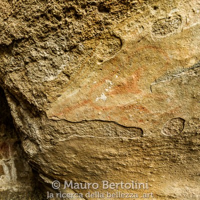 Al di sotto, al limitare del pavimento terroso, le pitture rupestri meglio conservate colorano la roccia con tonalità rosso-aranciate. Forme amorfe e umanoidi, disegni geometrici o arzigogolati, immagini fantasiose, religiose o propiziatorie, reali nel passato e ora flebili ricordi.