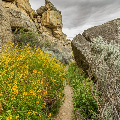 Oltrepassata la porta, l’ampio sentiero si avvia verso le butterate falesie di roccia ocracea.