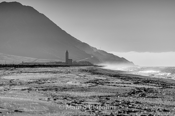 Panorama a Cabo de Gata, la Iglesia de La Almadraba de Monteleva fra mare e montagna